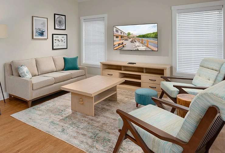 Make yourself at home in the quarters at The Cove! Each stately two-story building offers four spacious, air-conditioned apartments. Woodland or water view, upper or garden level, your ideal getaway awaits. For an unforgettable stay, families or groups of friends can book multiple apartments or the entire unit.
